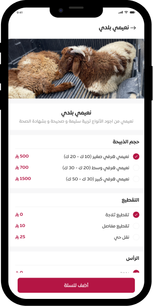 إمكانية اختيار الذبح، التقطيع، التغليف، والتوصيل إلى المنزل.